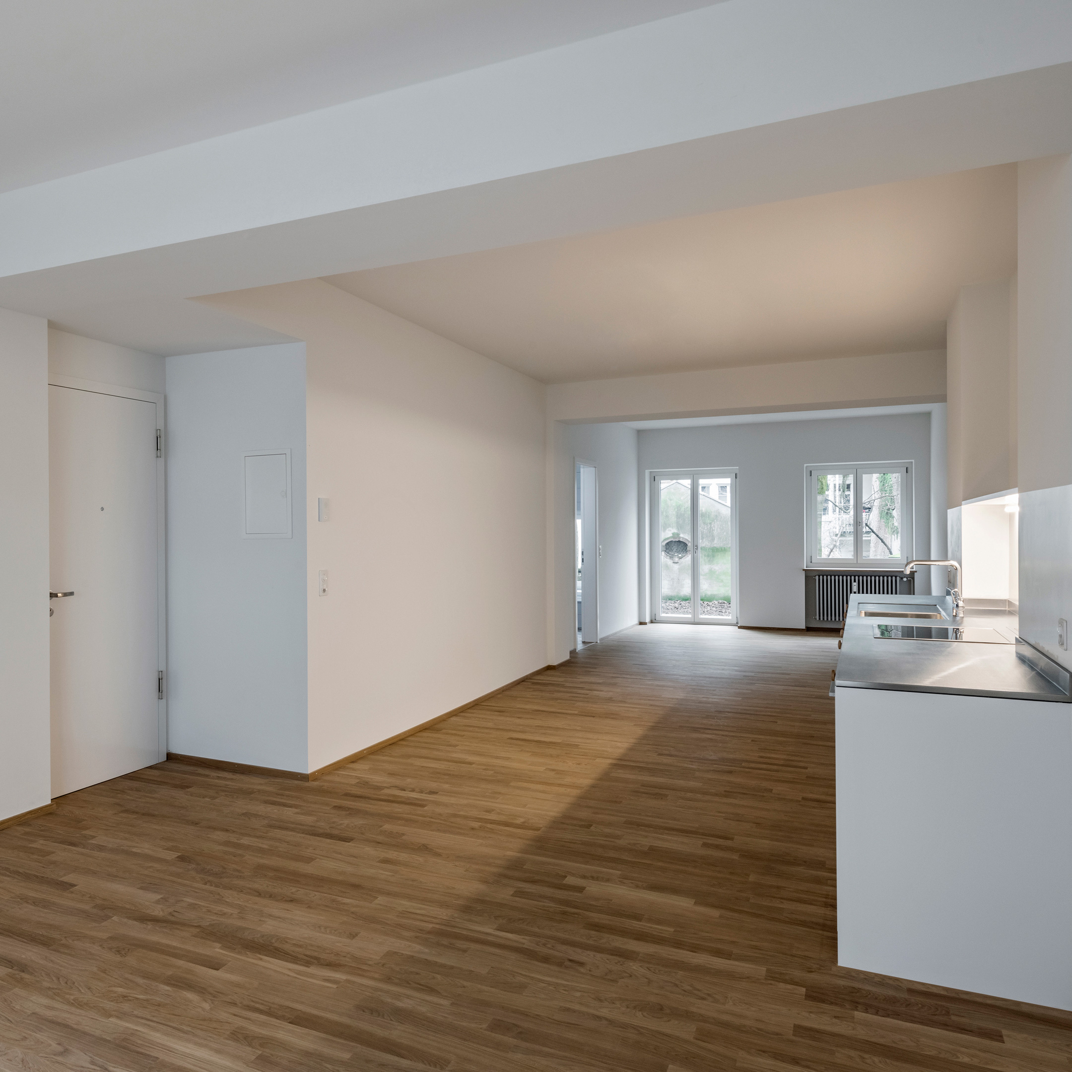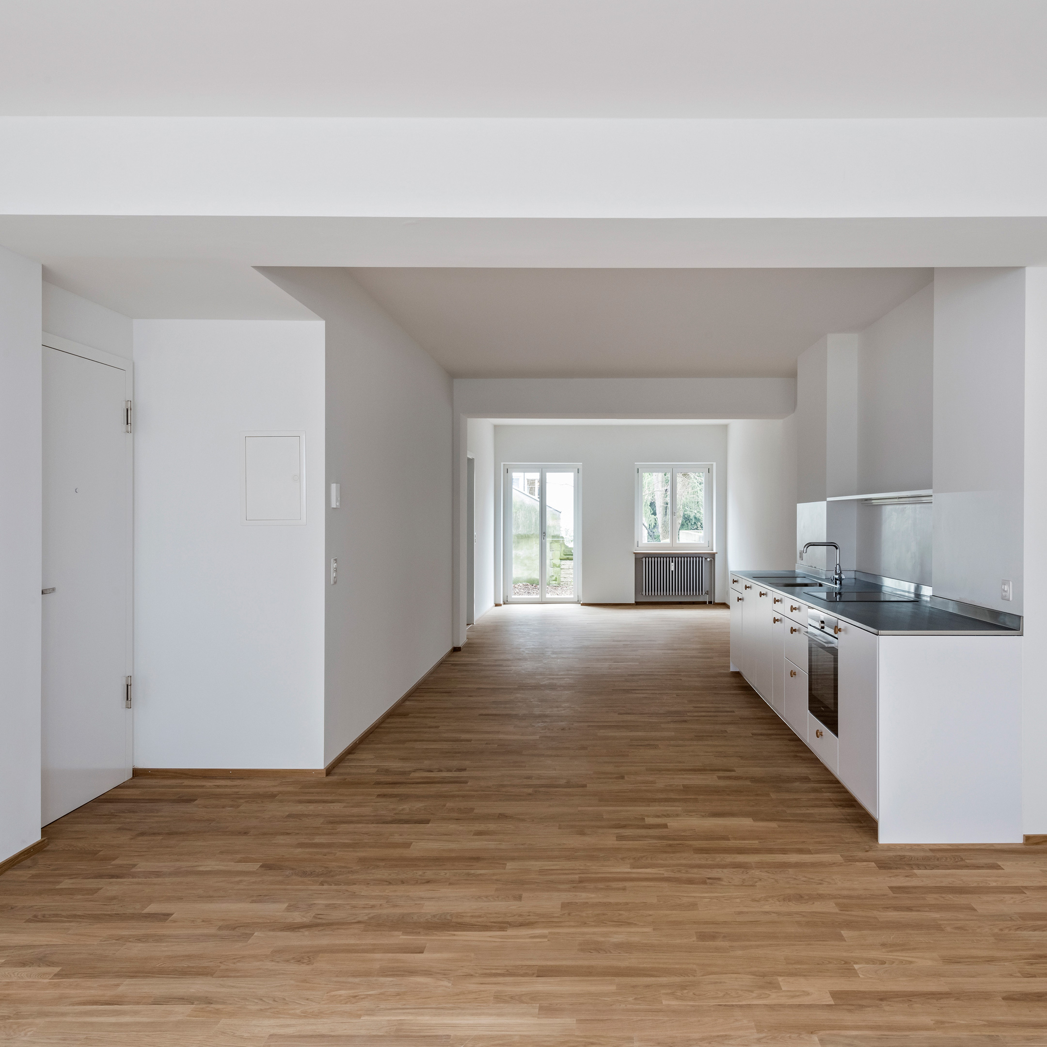 Die Raumaufteilung wurde optimiert, um den heutigen Anforderungen gerecht zu werden, ohne den Charakter des Hauses zu verlieren. Dabei wird der Raum effizient genutzt, und es entstehen helle, grosszügige Innenräume.