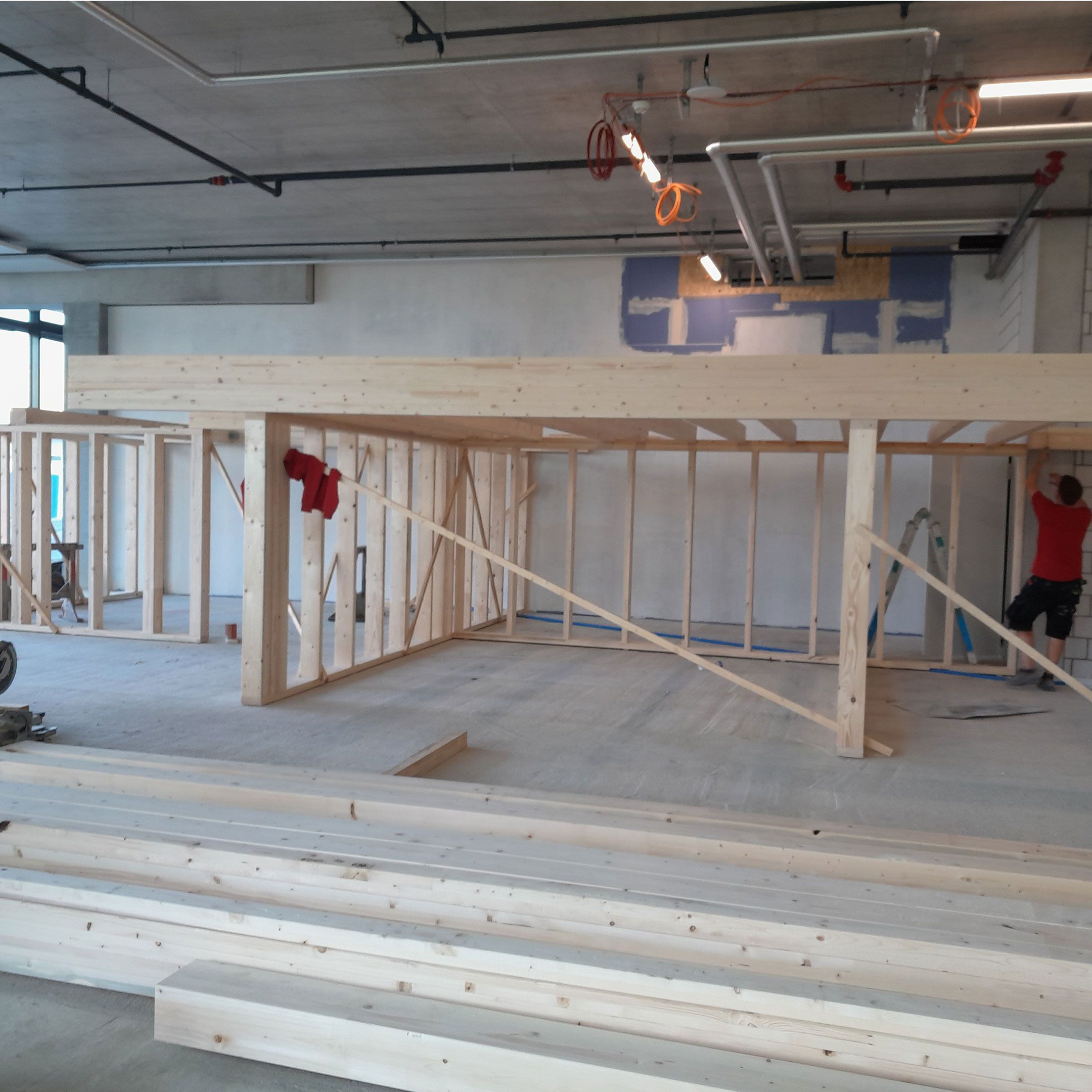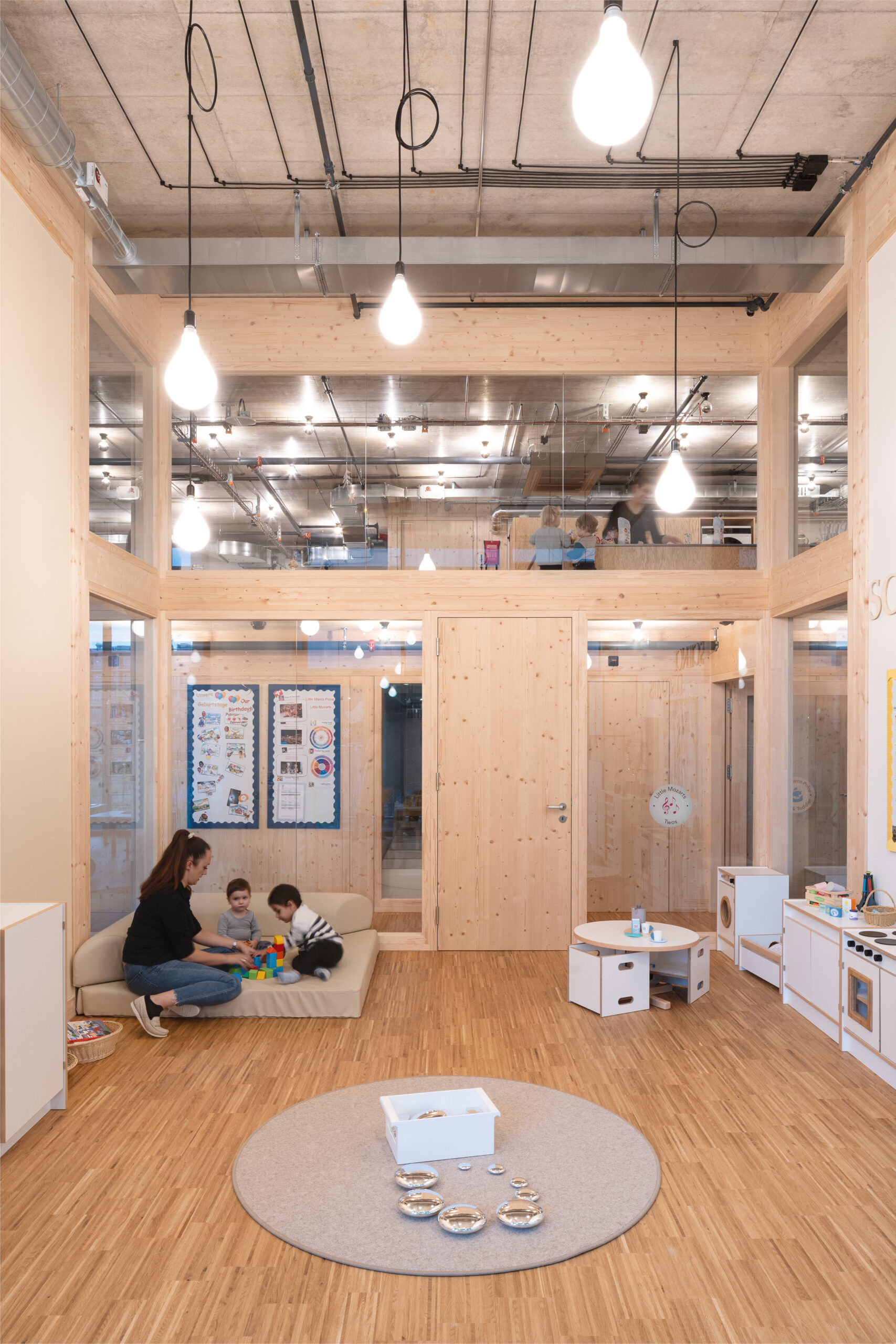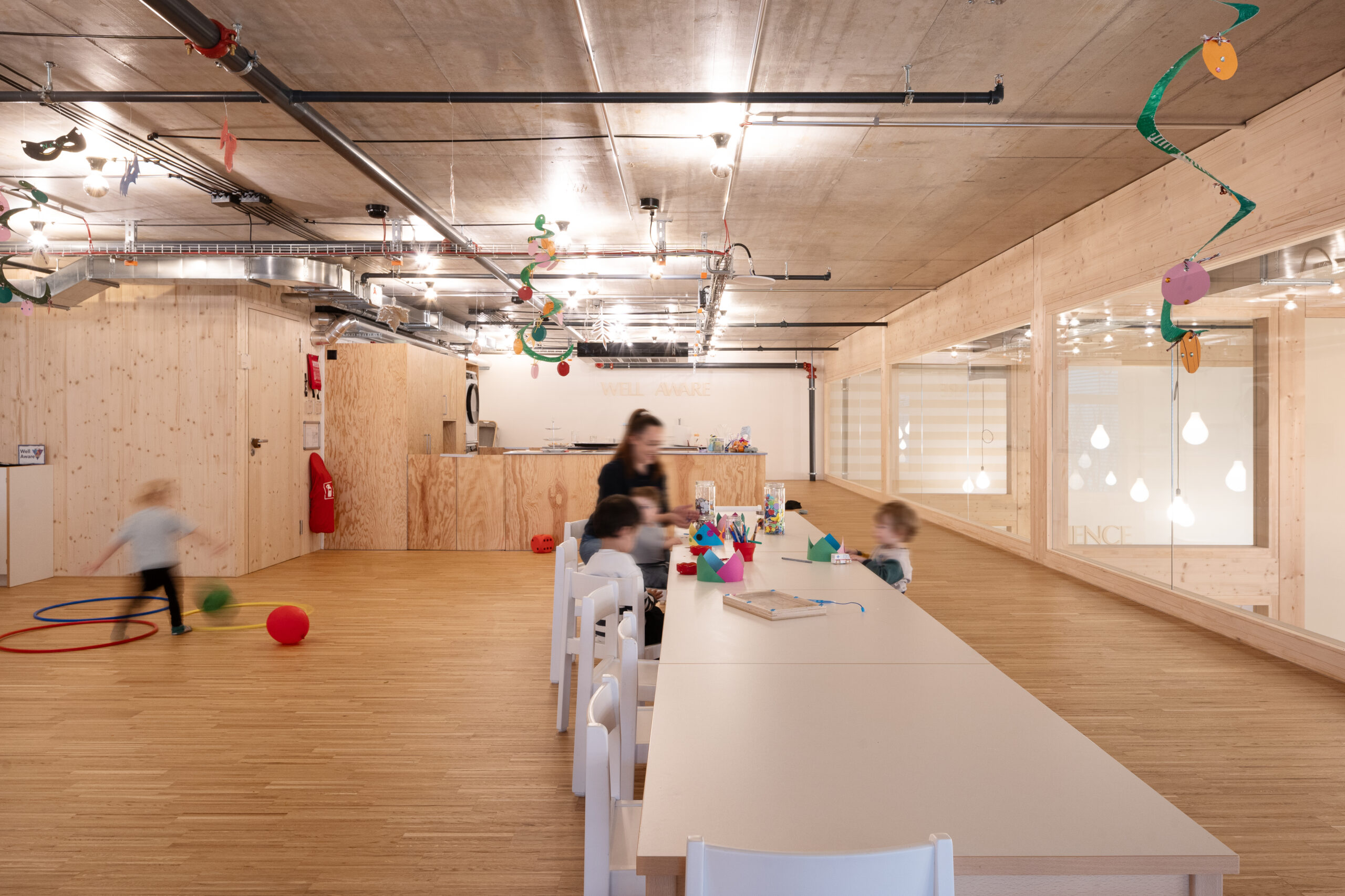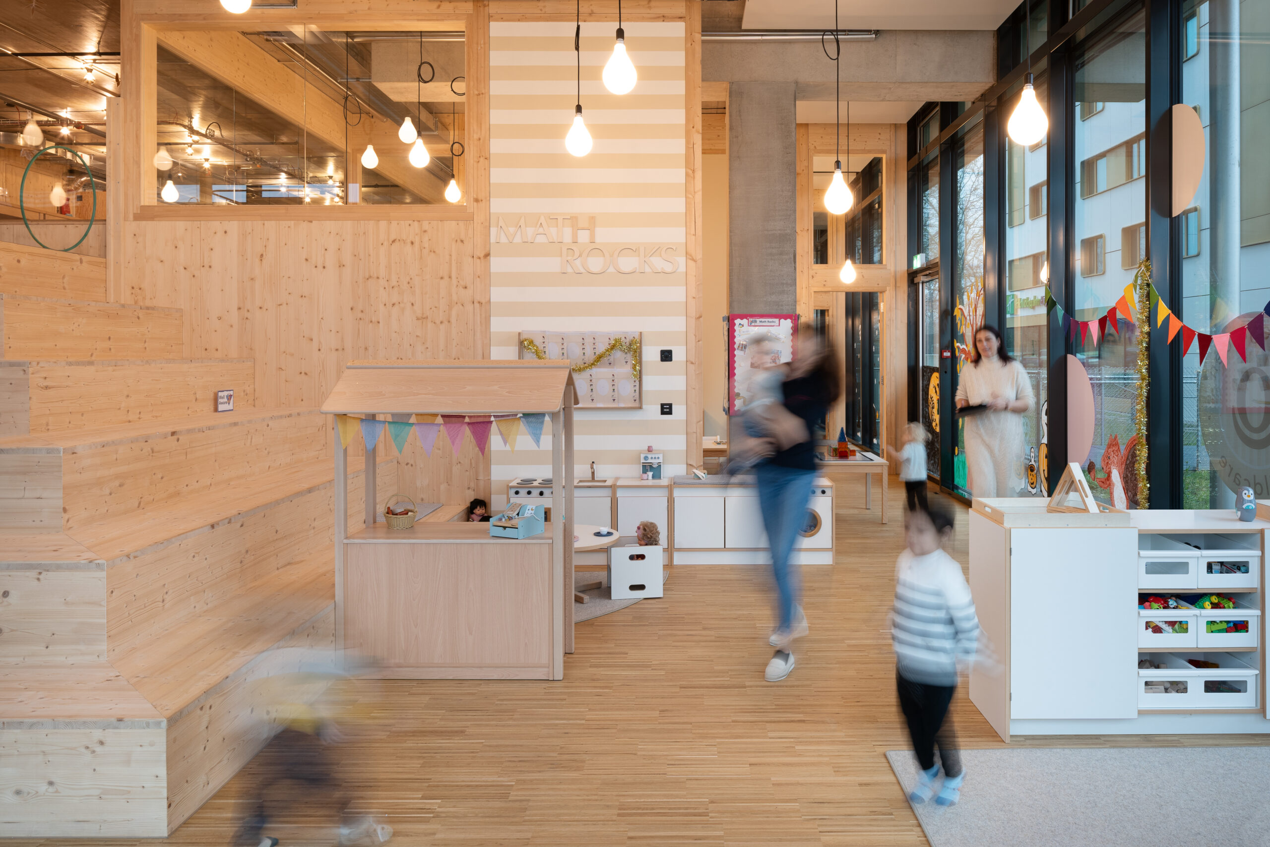Die drei Gruppenräume, die die volle Raumhöhe von 4,50 m ausnutzen, stehen im Kontrast zu den Ruheräumen mit einer Höhe von unter 2m. Durch den Einsatz großflächiger Verglasungen und des umfassenden Einsatzes von Konstruktionsholz entsteht eine erlebbare Struktur, die von den Kindern wie ein großes Spielgerät erforscht und bespielt werden kann.