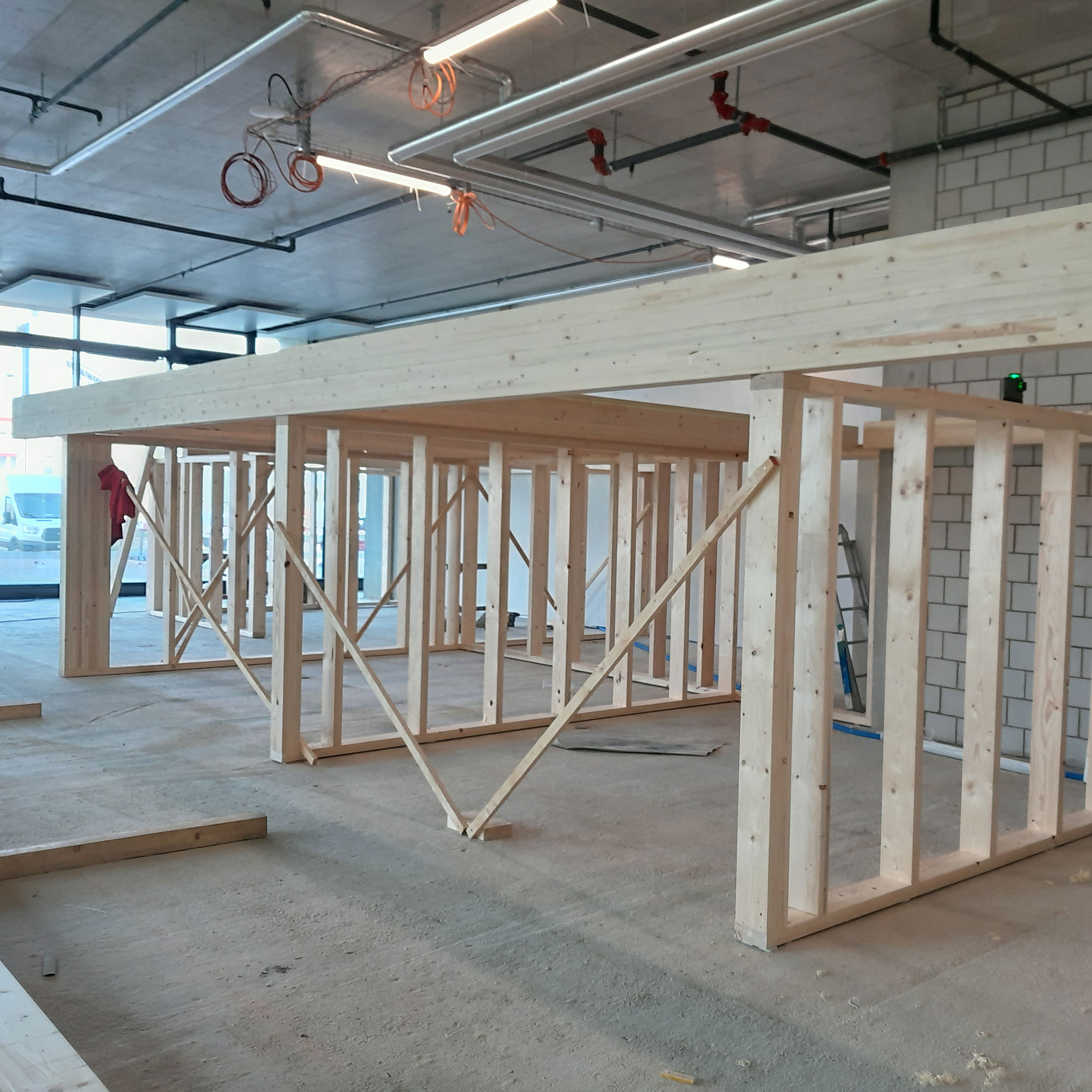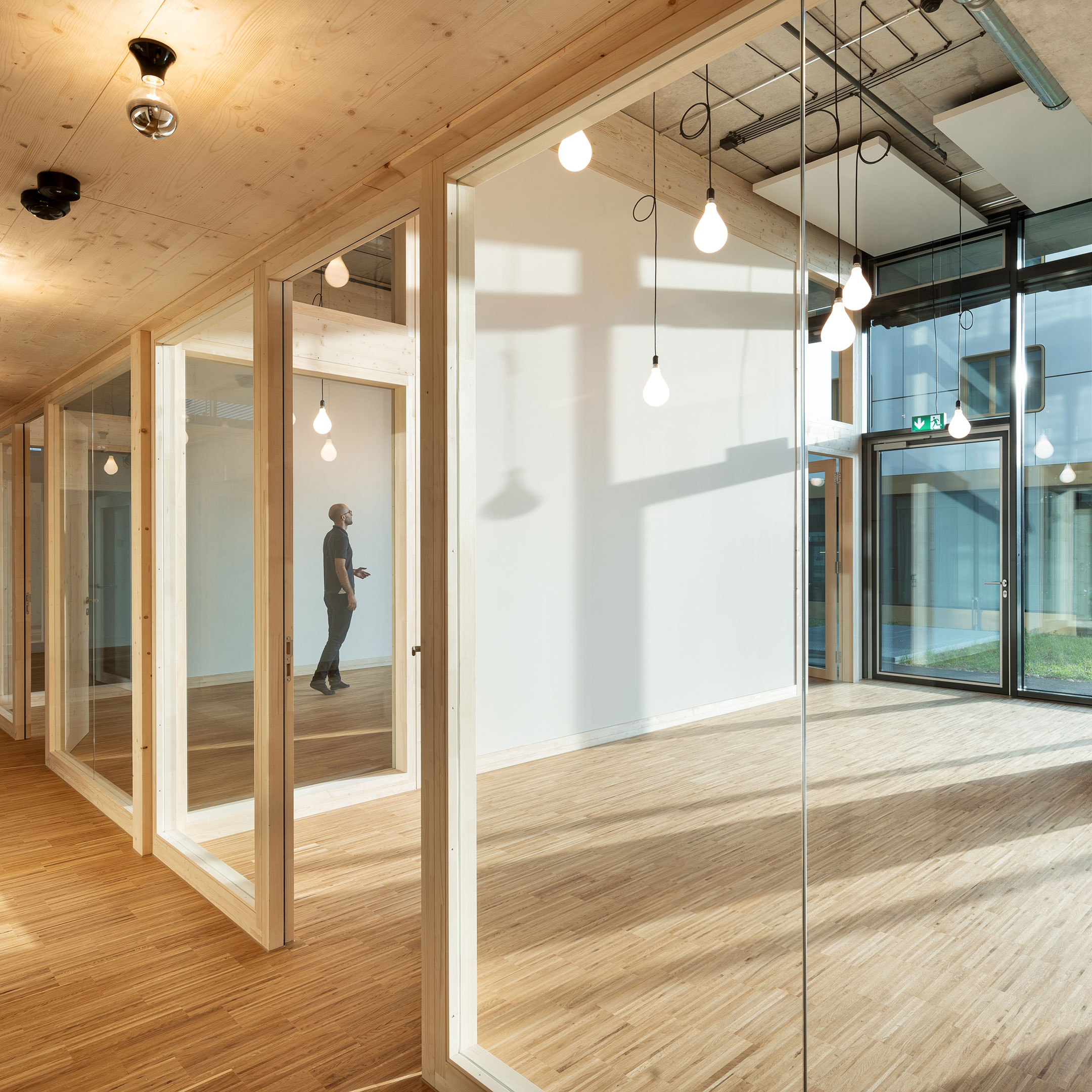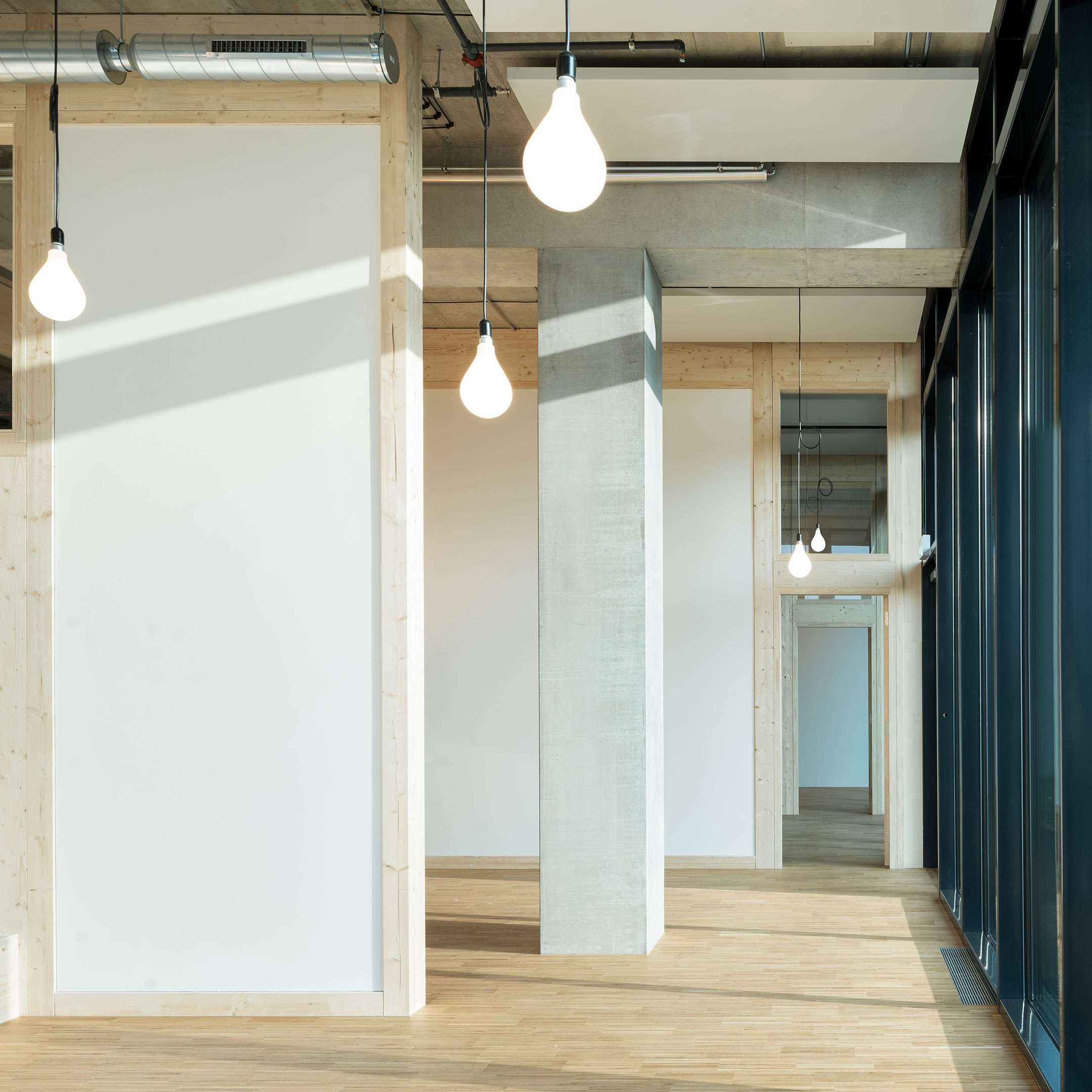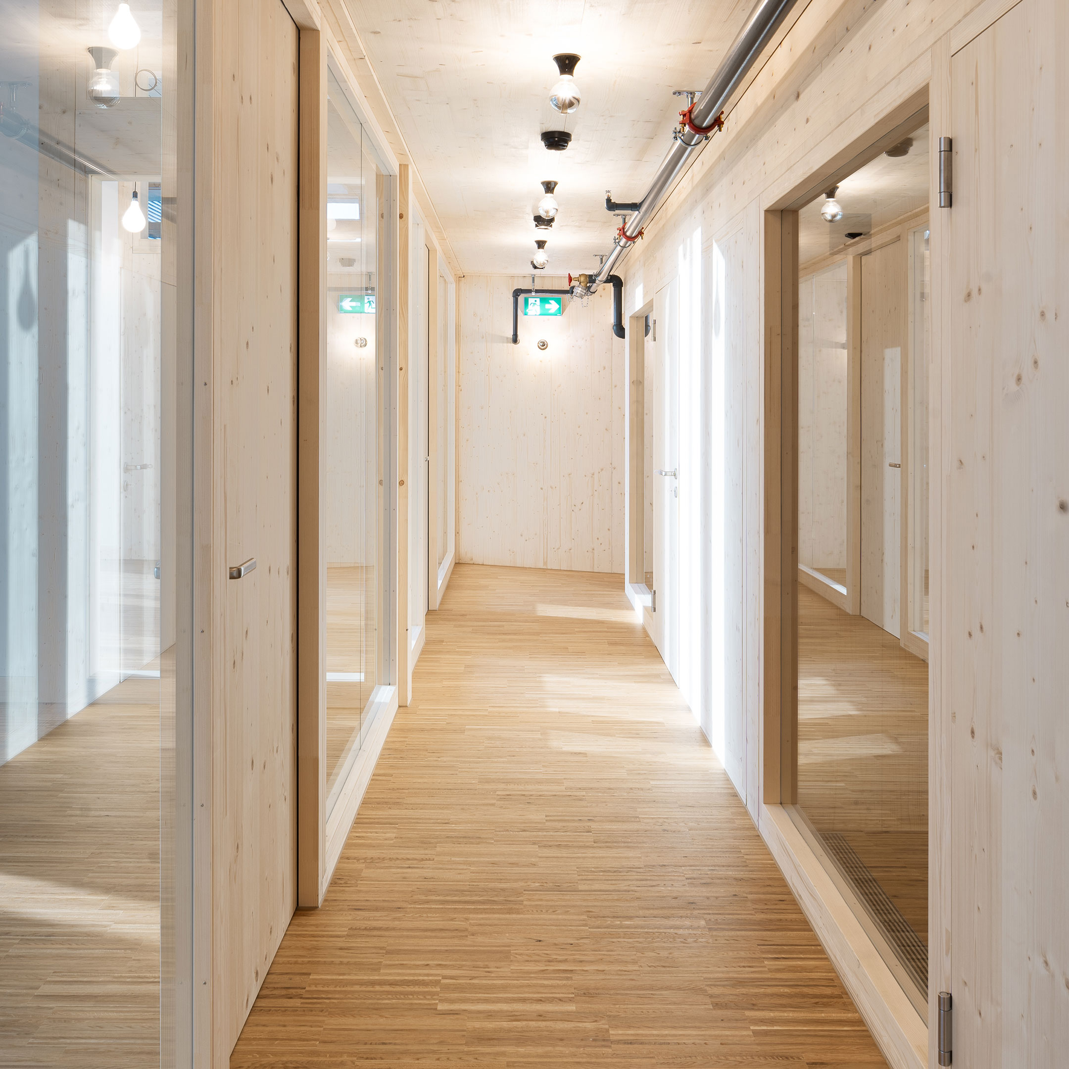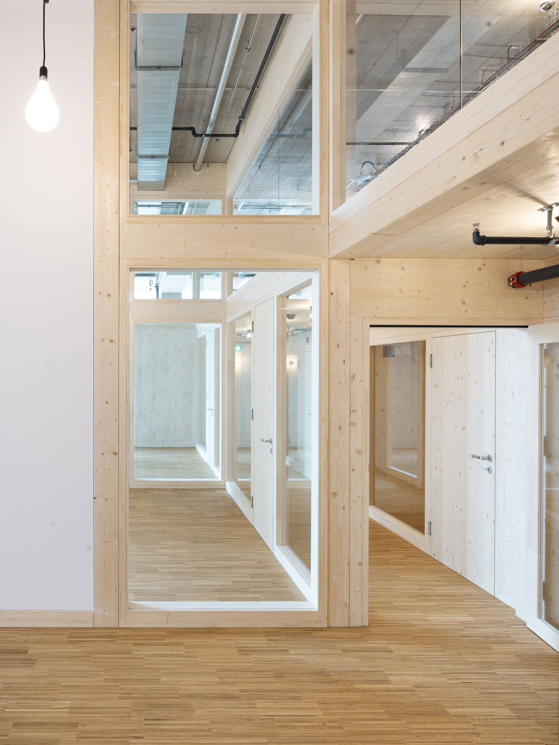 Die drei Gruppenräume, die die volle Raumhöhe von 4,50 m ausnutzen, stehen im Kontrast zu den Ruheräumen mit einer Höhe von unter 2m. Durch den Einsatz großflächiger Verglasungen und des umfassenden Einsatzes von Konstruktionsholz entsteht eine erlebbare Struktur, die von den Kindern wie ein großes Spielgerät erforscht und bespielt werden kann.