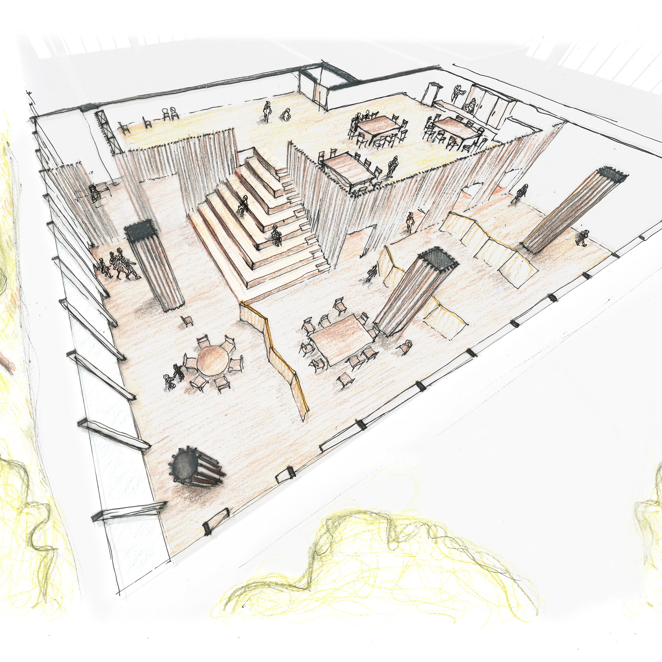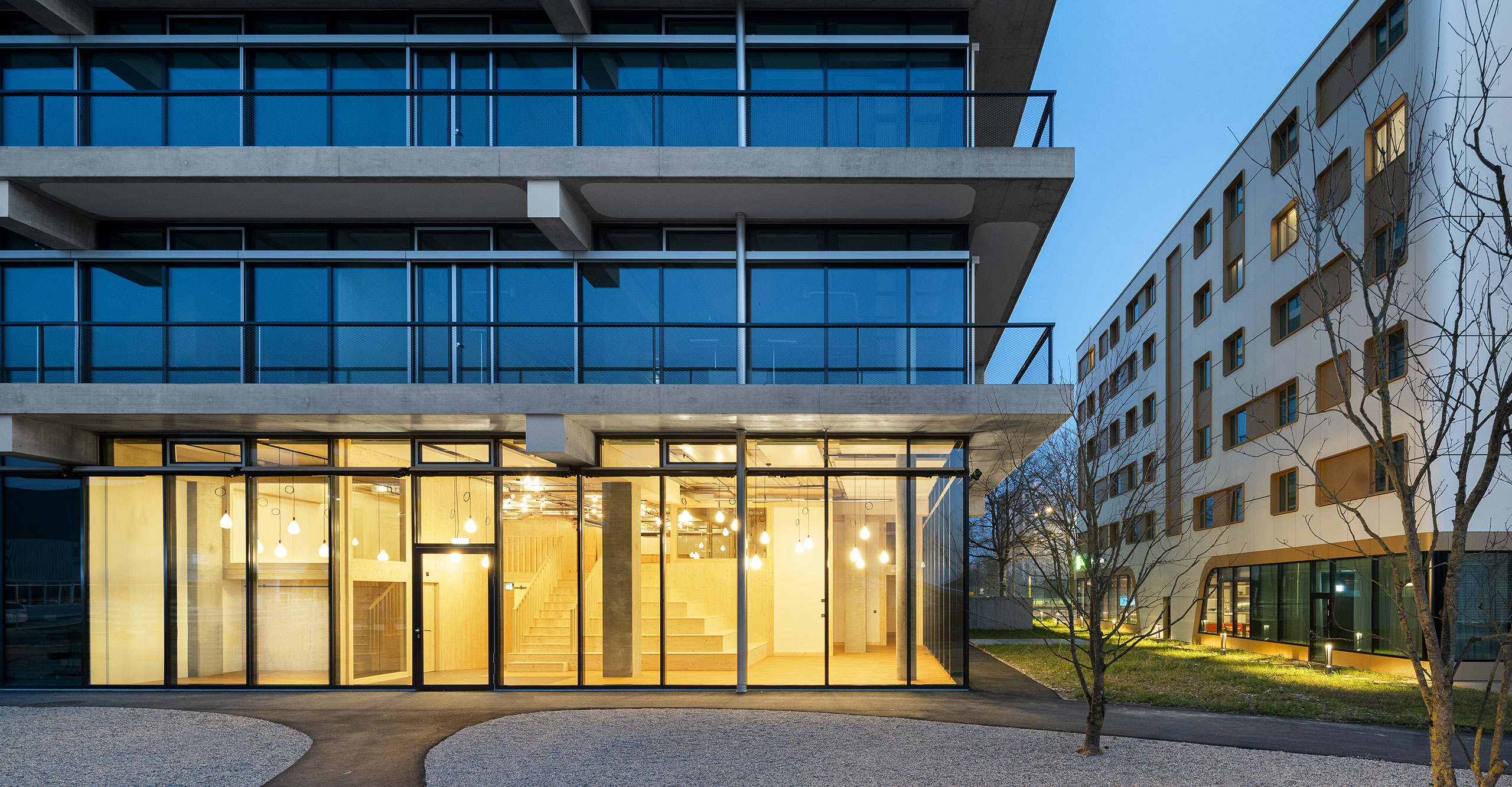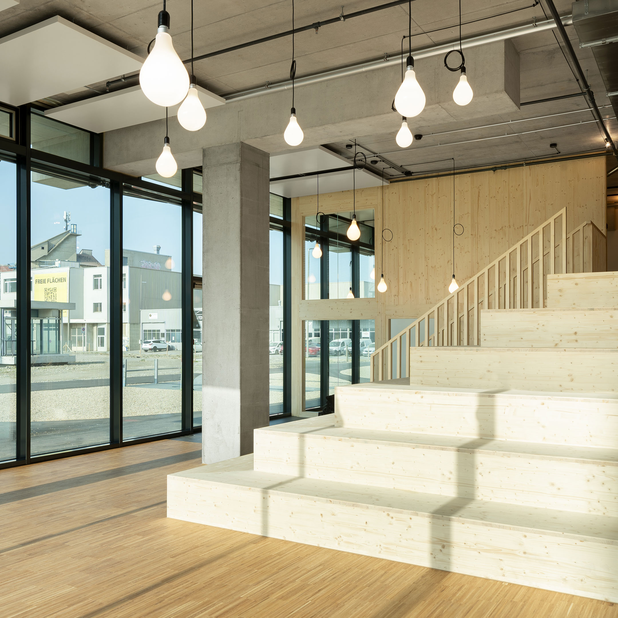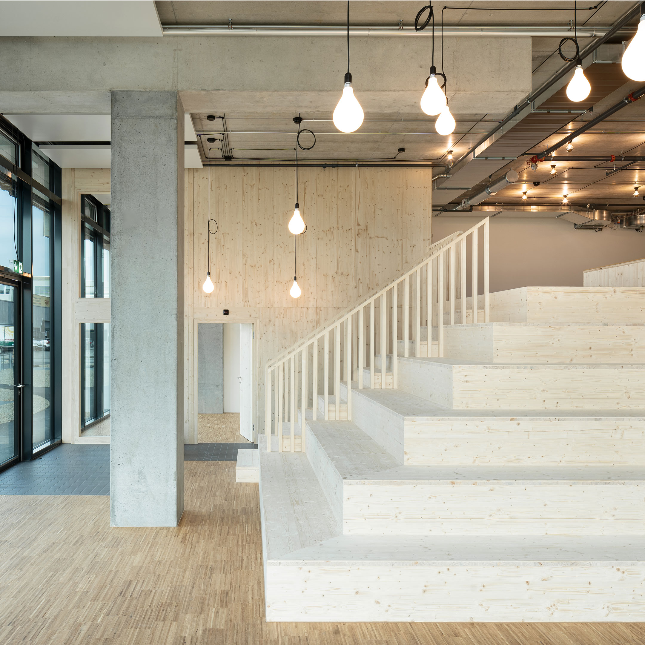 Das zentrale und prägende Gestaltungselement bildet die Stufenpyramide in der Gemeinschaftszone. Diese dient sowohl der Erschließung der Galerie als auch als Tribüne, auf der die Kinder spielen können. Zudem bietet die Pyramide Platz für soziale Interaktionen und wird bei gemeinsamen Anlässen als Treffpunkt genutzt. Von den Holzstufen aus haben die Kinder einen wunderbaren Blick auf die startenden und landenden Flugzeuge des Euroairports und können von hier aus vom Fliegen träumen.