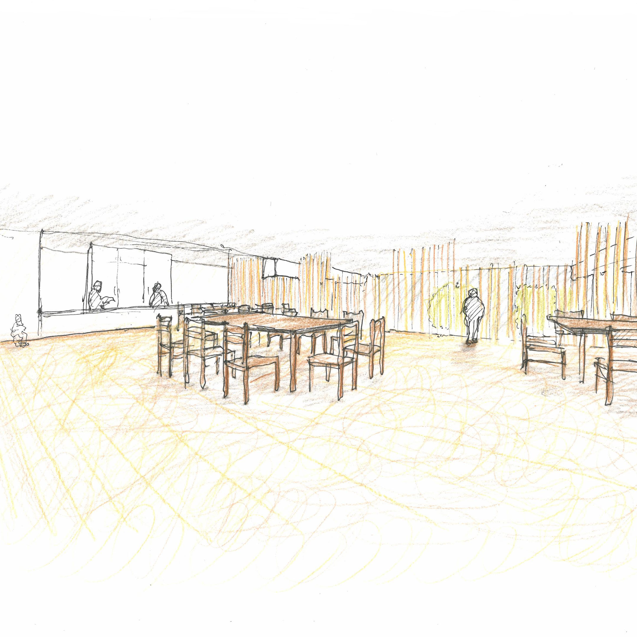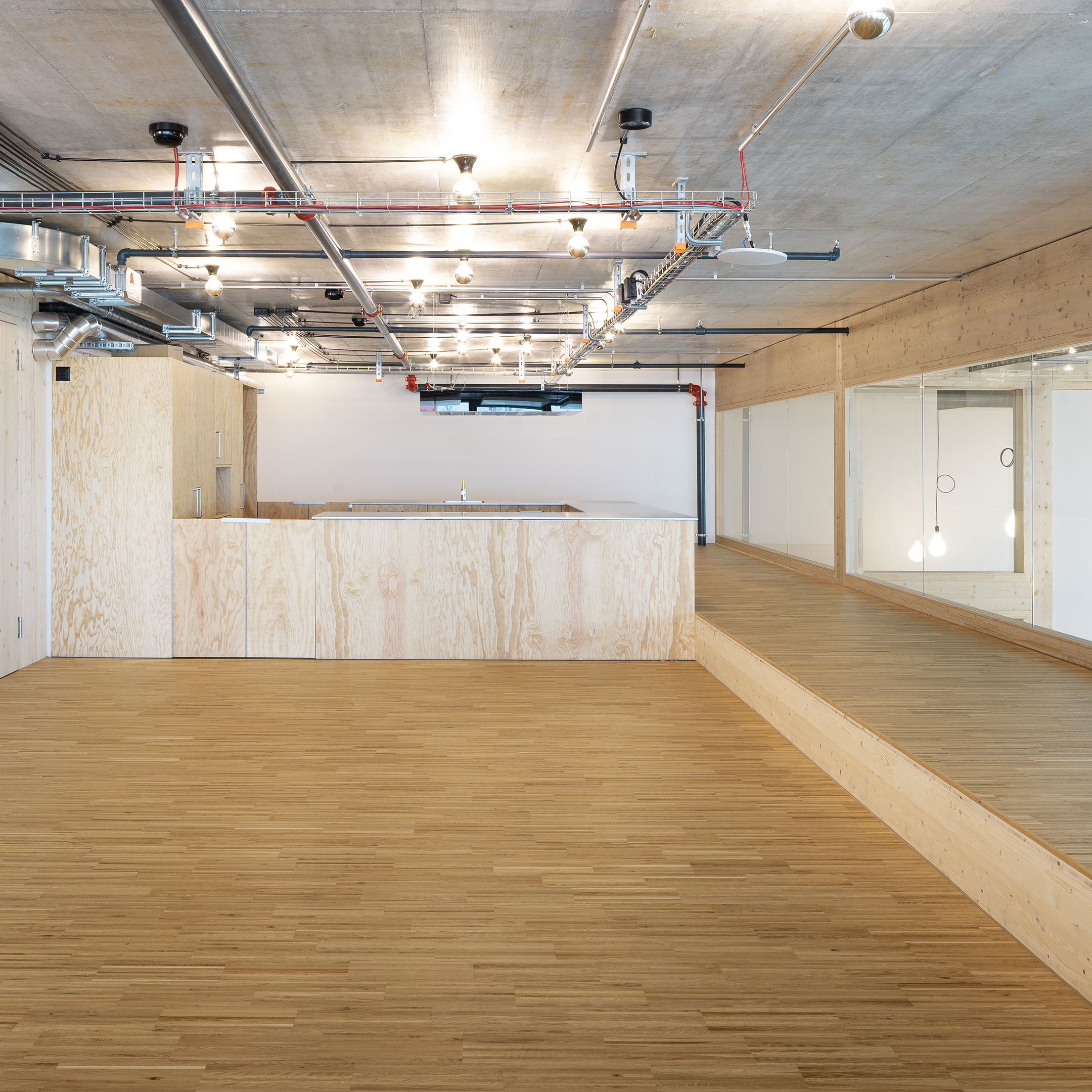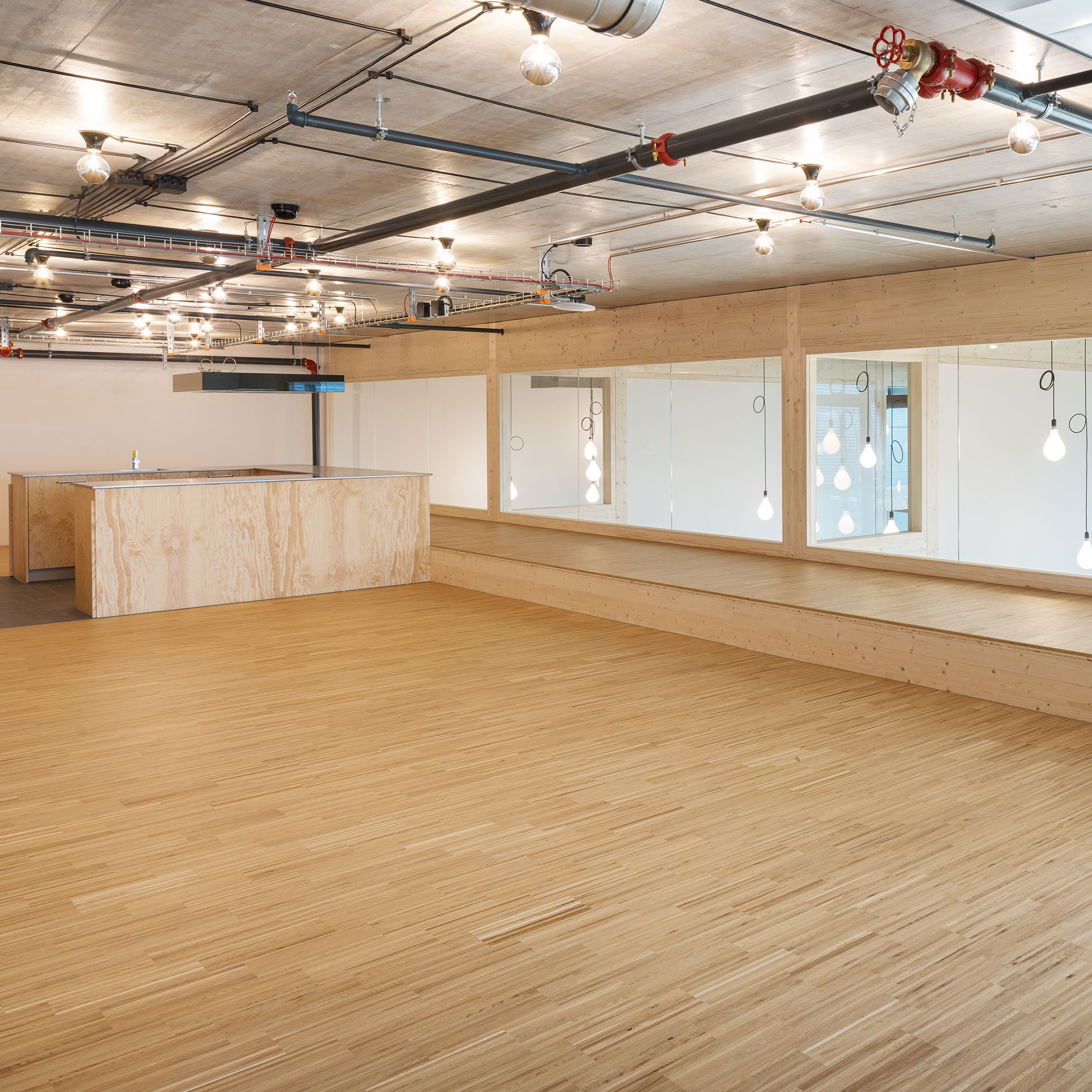 Auf der Galerie ist die Küche mit einem großzügigen Gemeinschaftsraum angeordnet. Dieser Raum wurde speziell für die Kinder als Werkstatt zum Mitkochen mit den Betreuern und zum Erlernen praktischer Fertigkeiten entworfen. Nach dem Essen können sich die Kinder im grosszügigen Gemeinschaftsbereich treffen um zu spielen und dabei durch die Sicherheitsverglasung der Galerie sowohl in die darunterliegenden Gruppenräume als auch ins Freie und in die Natur blicken.