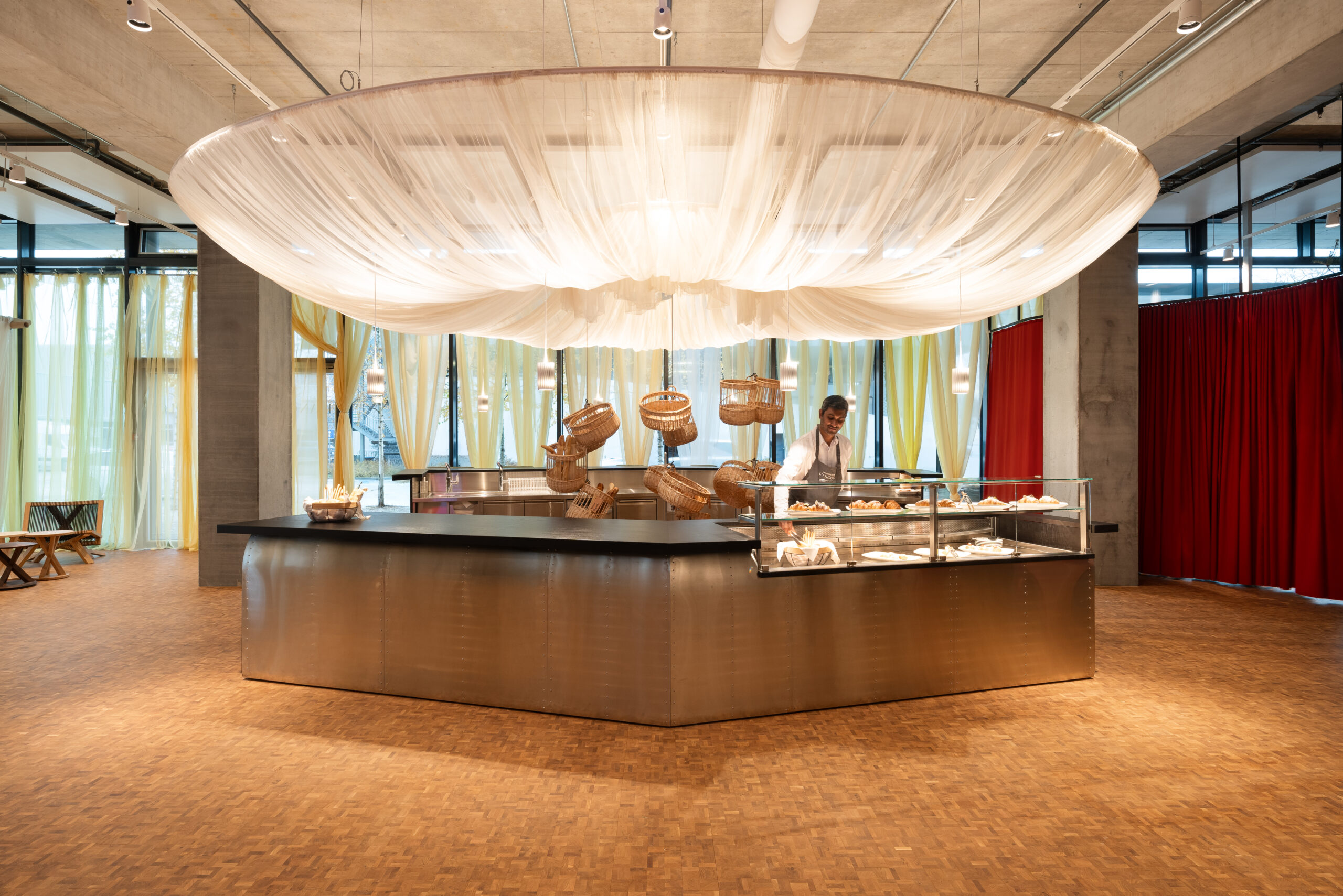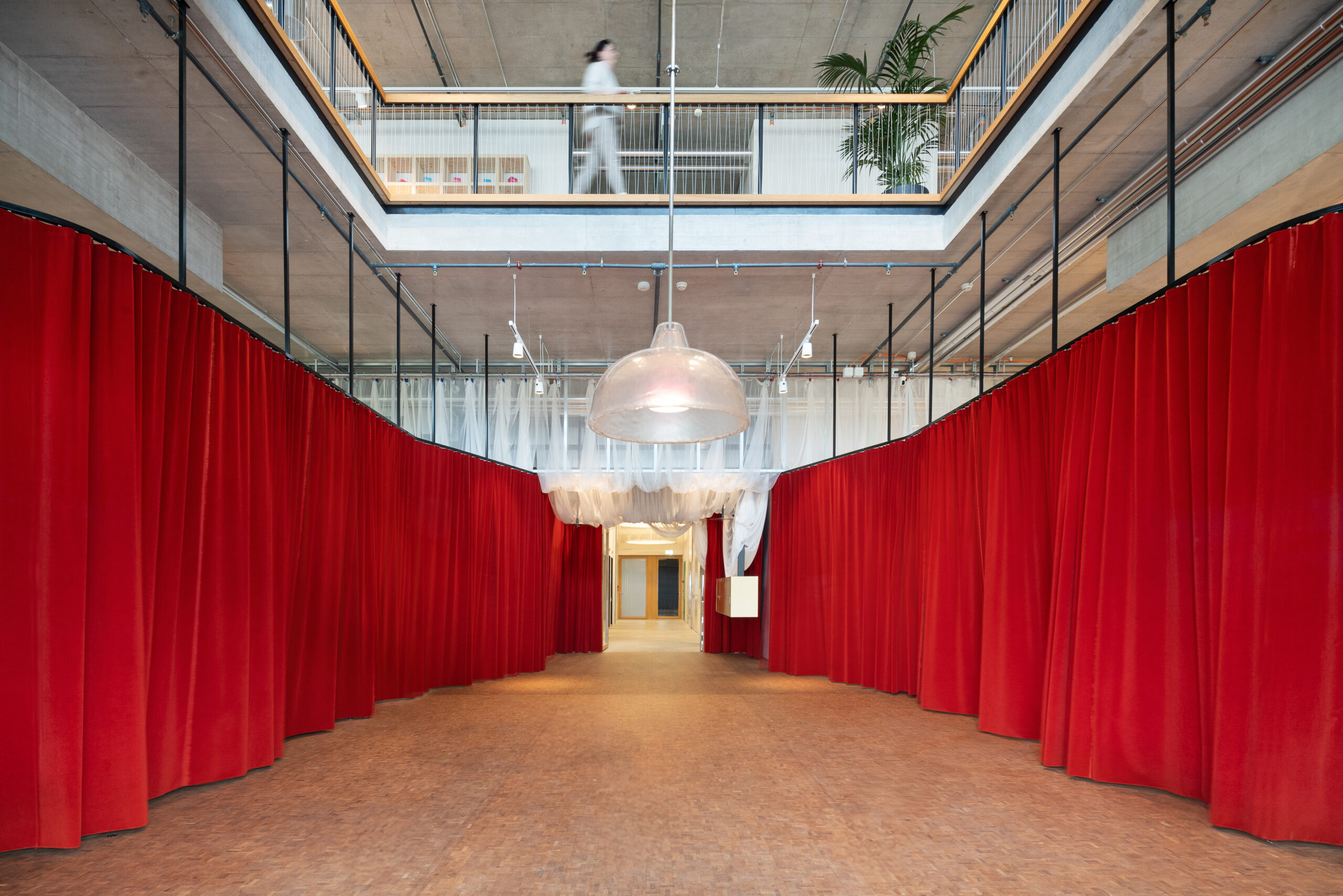 Gesprächsstoff am Bistrotisch und Lesestoff in der Lounge sind für das Materialisierungskonzept entscheidend. Denn die diversen Nutzungen sollen auf der multifunktionalen Fläche -wie auf einer Bühne- inszeniert werden. Mit Vorhängen und grossen Mengen an Stoffen aus Restbeständen wird in einer archaischen Machart das gesamte Erdgeschoss verkleidet und eingepackt. Diese Herangehensweise soll den Marktplatz flexibel halten, damit zukünftige temporäre oder permanente Nutzungen mühelos in das Gesamtkonzept eingebunden werden können.