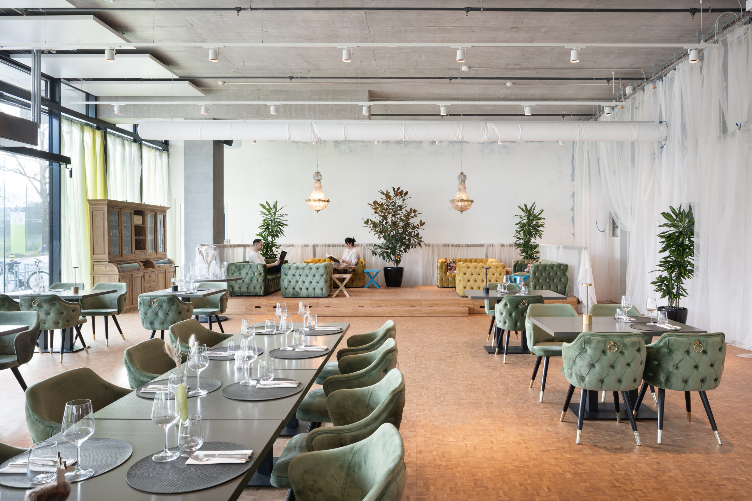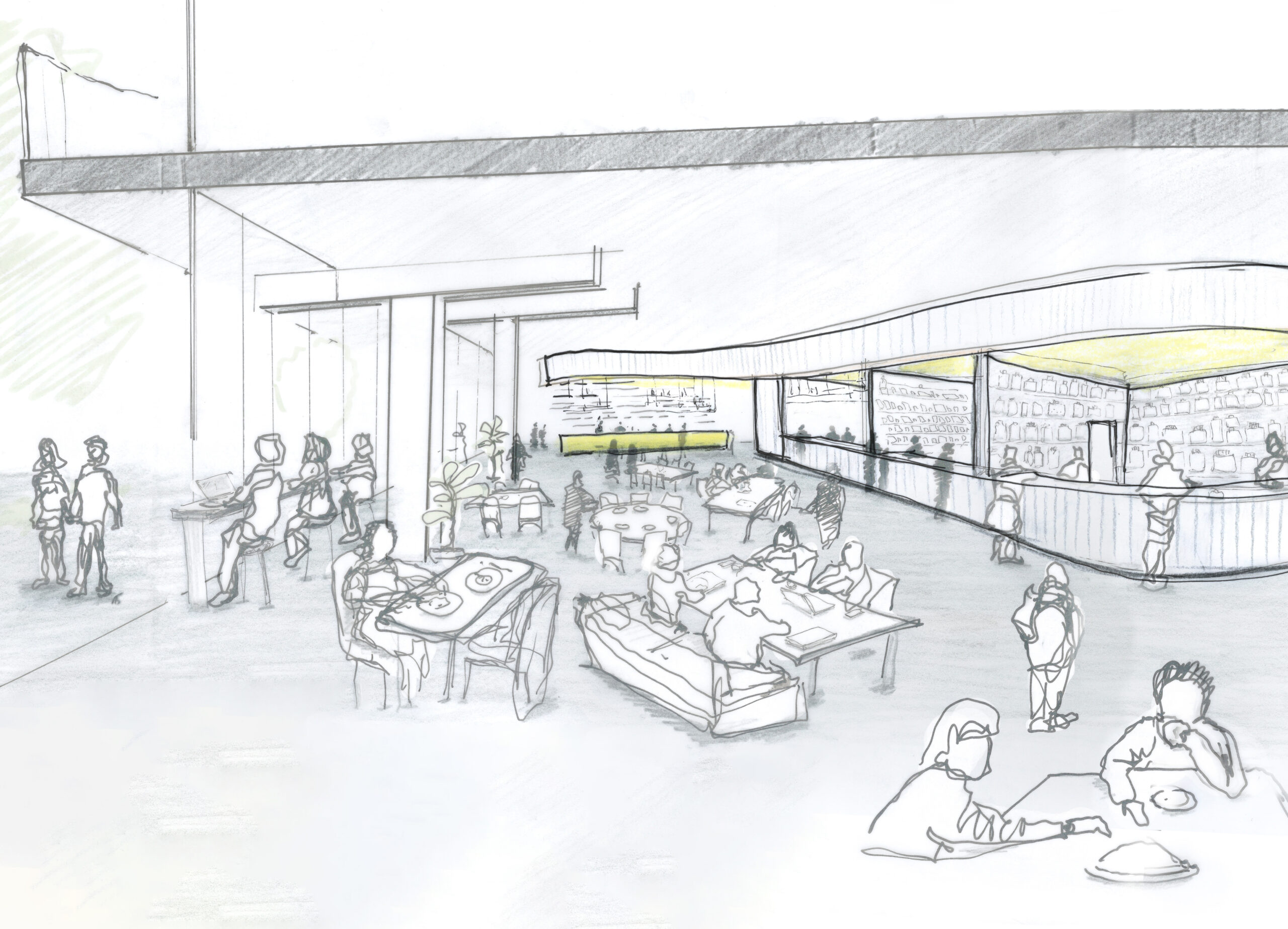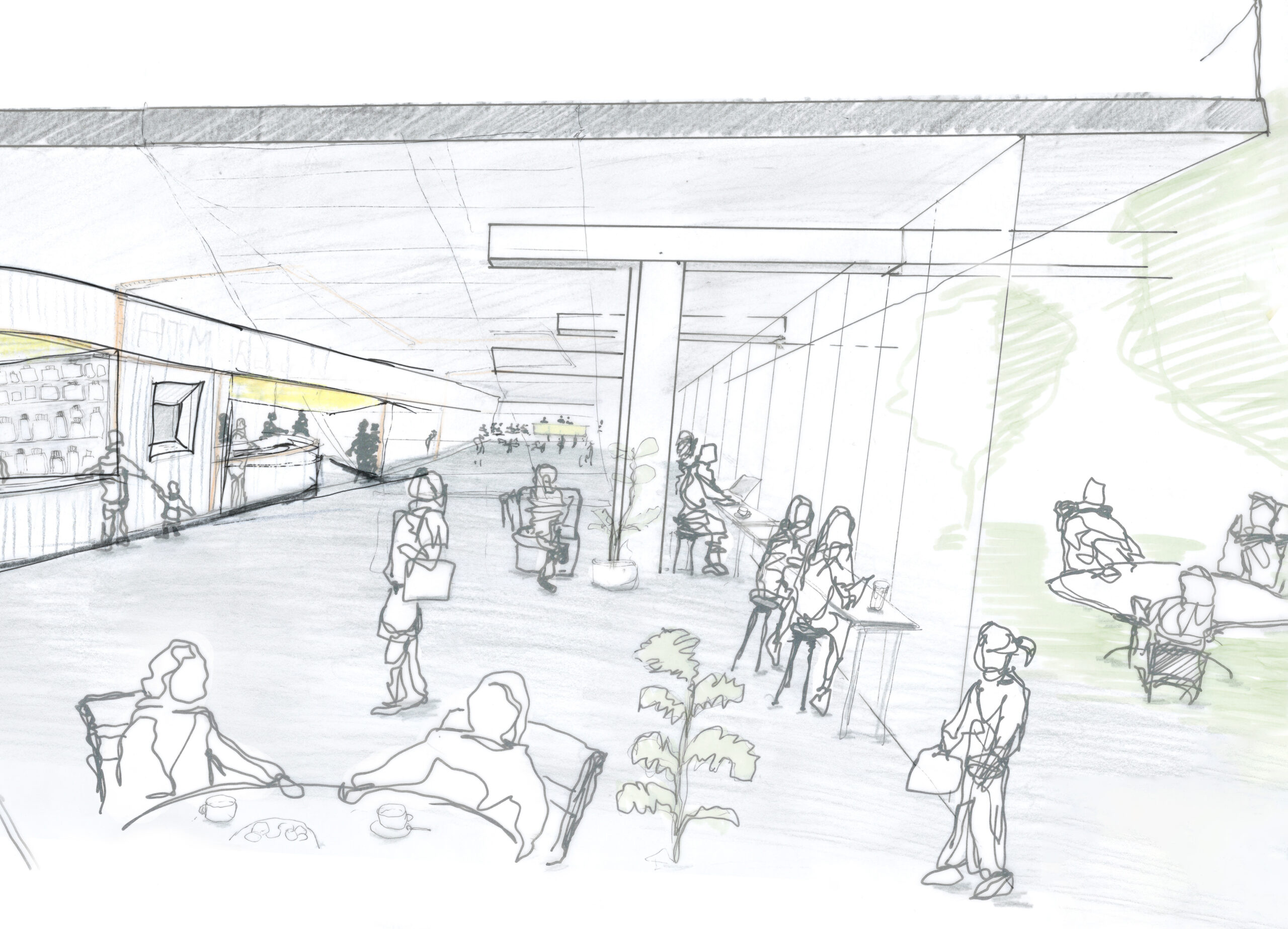 Die neue Bar und die verschiebbare Bäckerei unterstützen die Durchgängigkeit des architektonischen Konzepts durch die gemeinsamen Gestaltungsprinzipien und die einheitliche Materialität.