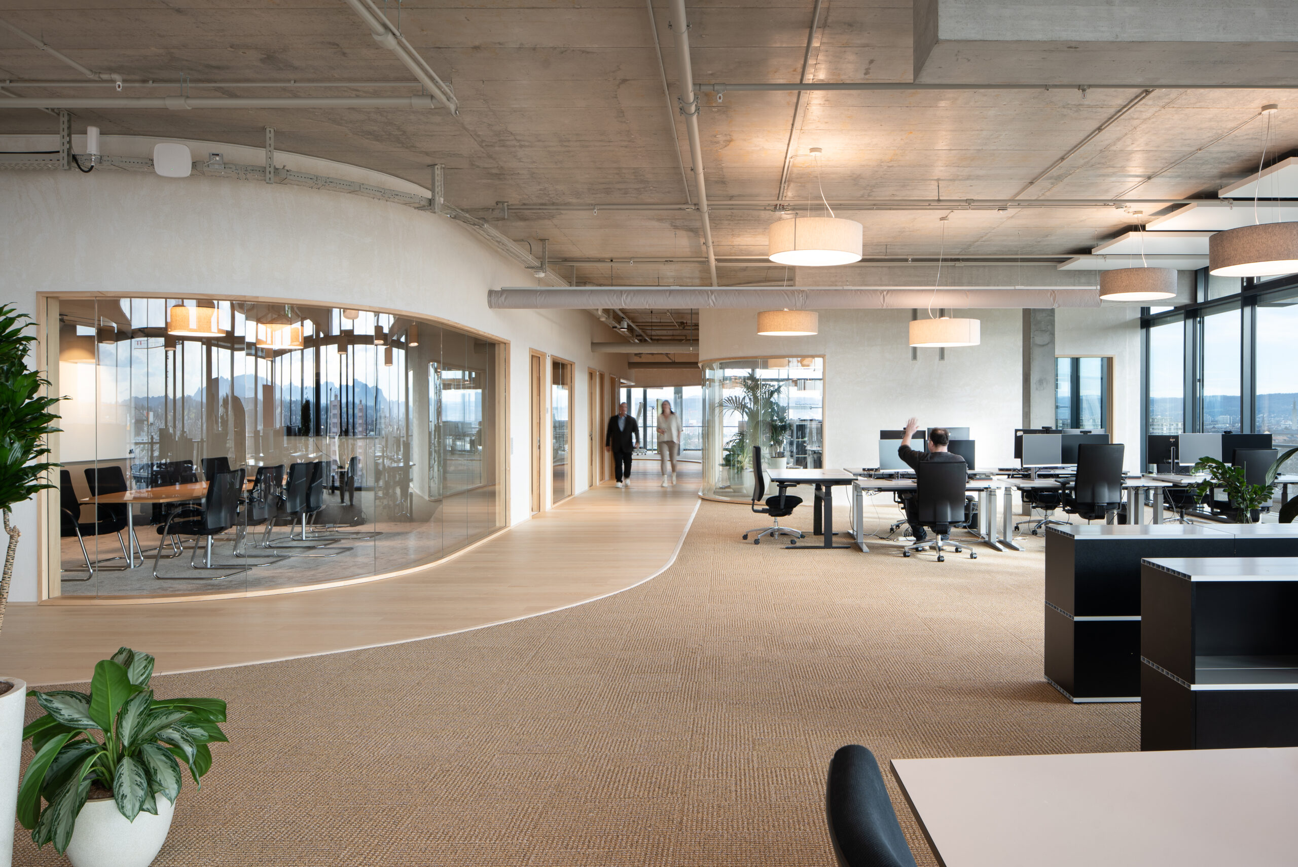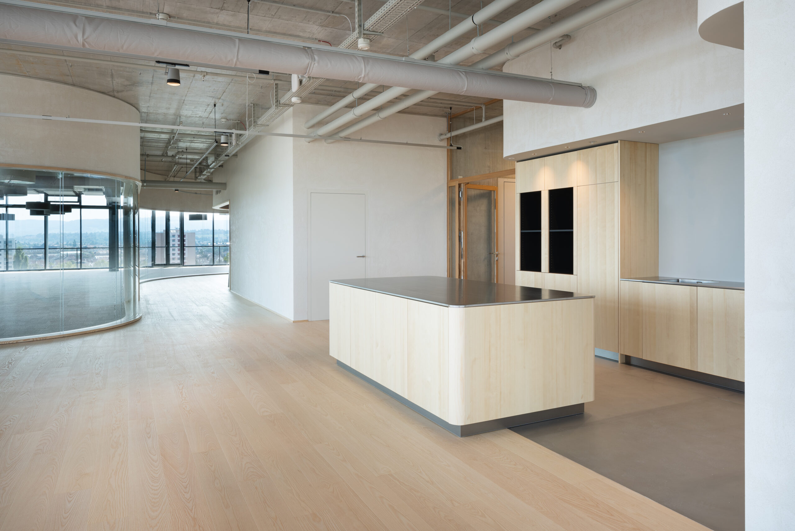 Die Kombination aus präzise ausgeführten, hochwertigen Materialien und bewusst sichtbaren Rohbauteilen erzeugt eine Spannung, die sowohl die funktionalen Anforderungen als auch die ästhetischen Ansprüche zeitgemässer Büroflächen erfolgreich vereint.