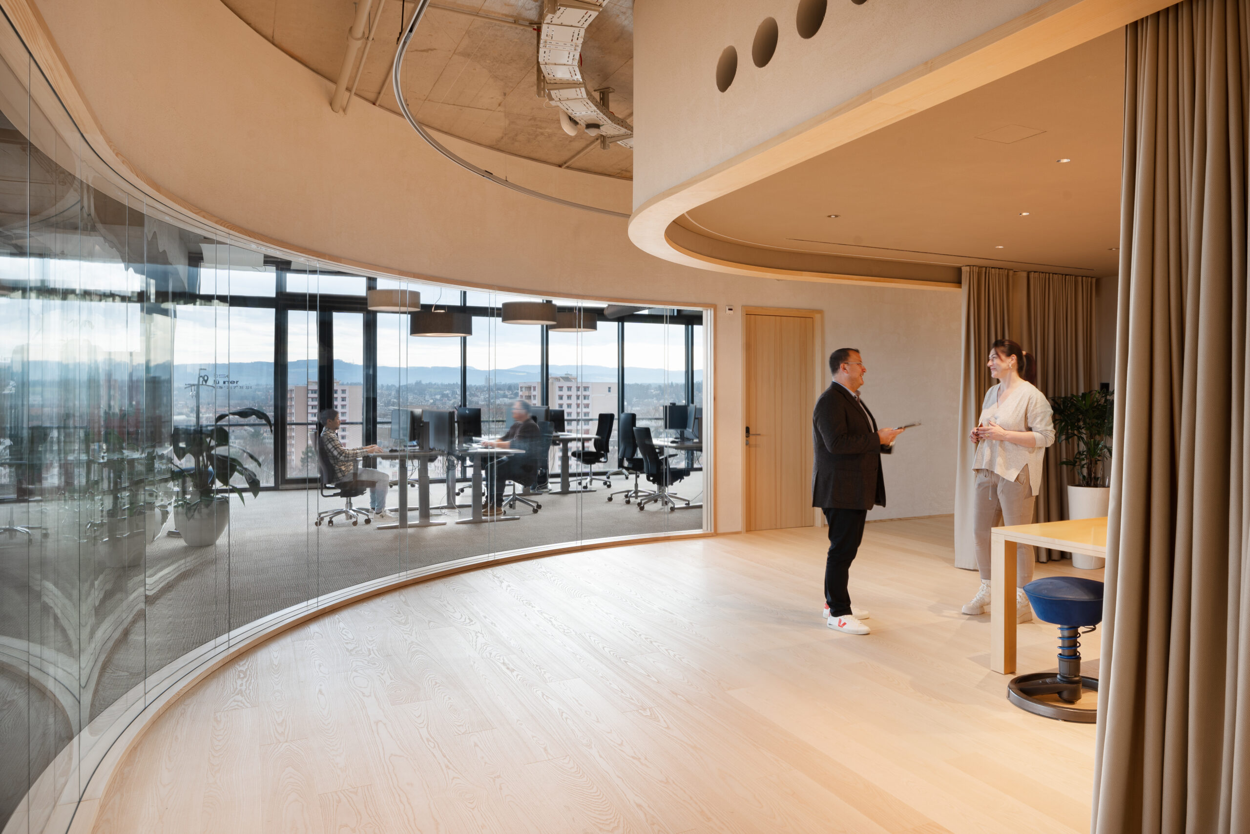 Mit seinen zehn Etagen prägt das ALBA HAUS im Bachgraben, Allschwil BL, nicht nur das Erscheinungsbild des gesamten Quartiers, sondern setzt auch neue Maßstäbe für zukunftsweisende Arbeitsumfelder. Hier hervorzuheben ist der Ausbau des neunten und obersten Geschosses, das den neuen Hauptsitz von Medgate Schweiz beherbergt.